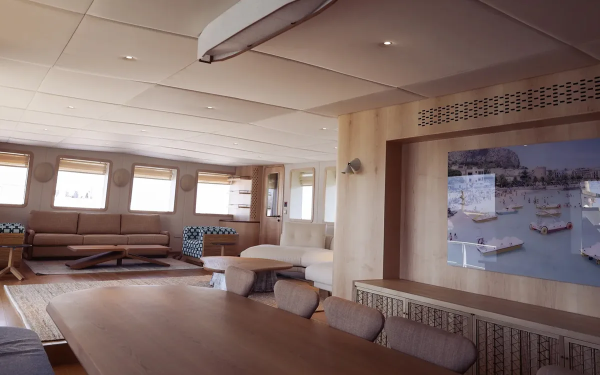 Her güverte, özel seçilmiş tik kaplamalarla baştan döşendi. 945 GT hacme sahip iç mekânlar ise doğal dokular, yumuşak renk tonları ve çağdaş mobilyalarla yeniden tasarlandı. Dönüşüm sürecinde bazı orijinal bileşenlerin korunarak modern unsurlarla uyumlu hale getirildiği belirtildi.