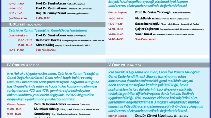 İstanbul Barosu Deniz Hukuku Komisyonu Yürütme Kurulu Başkanı Av. Türker Yıldırım’ın açılış konuşmasıyla başlayacak etkinlikte program şu şekilde :