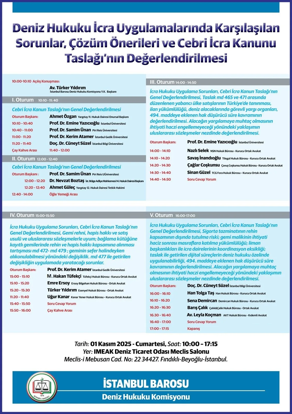 İstanbul Barosu Deniz Hukuku Komisyonu Yürütme Kurulu Başkanı Av. Türker Yıldırım’ın açılış konuşmasıyla başlayacak etkinlikte program şu şekilde :