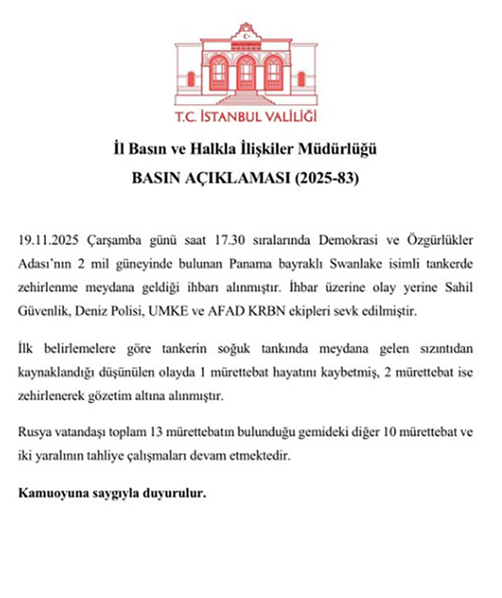 19.11.2025 çarşamba günü (bugün) saat 17.30 sıralarında Demokrasi ve Özgürlükler Adası’nın 2 mil güneyinde bulunan Panama bayraklı Swanlake isimli tankerde meydana gelen zehirlenme ihbarına ilişkin basın açıklamamız…