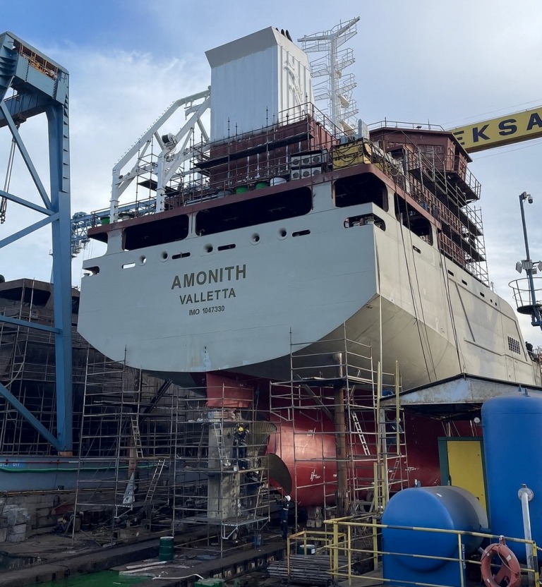 Dört gemilik serinin son gemisi olan M/T AMONITH, ödüllü hidrodinamik gövde yapısının ek CFD analizleriyle geliştirilmesi sayesinde %6 daha düşük direnç sağlayacak şekilde optimize edildi. Tamamı Türk mühendislerinin yürüttüğü Ar-Ge ve tasarım çalışmalarıyla ortaya çıkan proje, benzerlerine kıyasla %25 daha verimli sevk sistemi ile öne çıkıyor. Gemi, 8100 ton kargoyla tam yüklü durumda 2800 kW güçle 13 knot hıza ulaşabiliyor. Projede ulaşılan %45 yerlilik oranı ise tersanenin yerli üretim yaklaşımını yansıtıyor.