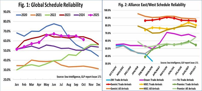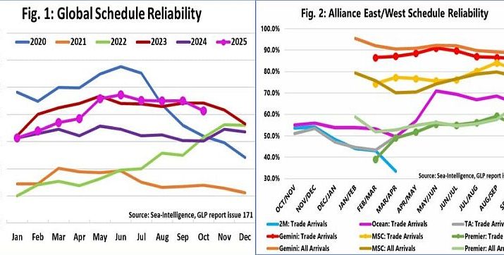 Danimarkalı analiz şirketi Sea-Intelligence’a göre, konteyner sektöründe küresel tarife güvenilirliği Ekim ayında aylık bazda 3,5 puan düşerek %61,4’e geriledi. Bu, üç aylık istikrarın ardından 2025 yılındaki ikinci önemli düşüş.