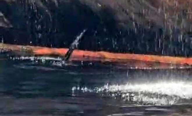Türk karasularına yaklaşık 28 mil uzaklıkta vurulan ve ardından yangın çıkan gemide soğutma çalışmaları sürerken, gemiden denize fuel-oil sızıntısı başladığı bildirildi.