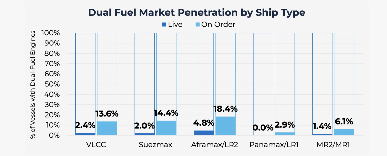 Tanker sektöründe, çift yakıt kullanımının yaygınlaşması henüz başlangıç aşamasında olmakla birlikte; aktif filo penetrasyonu Panamax/LR1 gemilerinde %0’dan Aframax/LR2 tonajında sadece %4,8’e kadar değişebiliyor. Bununla birlikte, sipariş defteri verileri yeni gemi inşa stratejisinde temel bir değişime işaret ediyor.