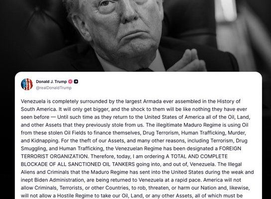 ABD Başkanı Truth Social’da yaptığı açıklamada, “Varlıklarımızın çalınması ve terörizm, uyuşturucu kaçakçılığı ve insan ticareti de dahil olmak üzere birçok başka nedenden dolayı, Venezuela rejimi yabancı terör örgütü olarak ilan edilmiştir” dedi. “Bu nedenle, bugün, Venezuela’ya giren ve çıkan tüm yaptırım uygulanan petrol tankerlerine tam ve eksiksiz bir abluka emri veriyorum.”