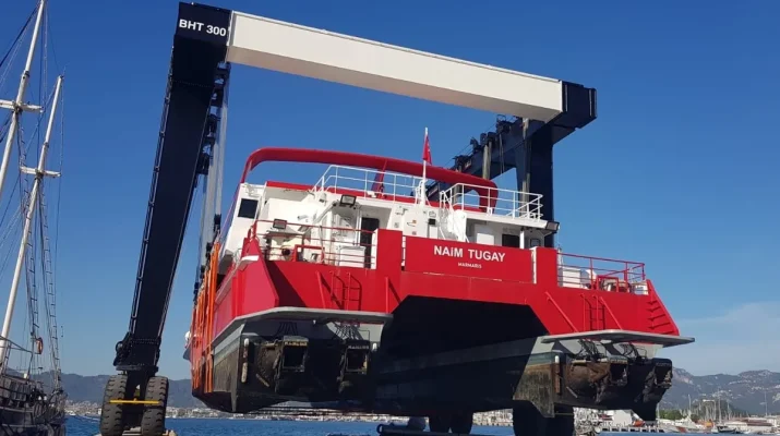 13,70 metre iç net genişliğe sahip olan tekne kaldırıcı, özellikle farklı tip ve boyutlardaki katamaran teknelerin güvenli şekilde taşınmasına olanak sağlıyor. Sistem, elektronik sürüş ve kontrol altyapısı, yüksek manevra kabiliyeti ve ağır hizmet koşullarına uygun yapısal tasarımıyla öne çıkıyor.