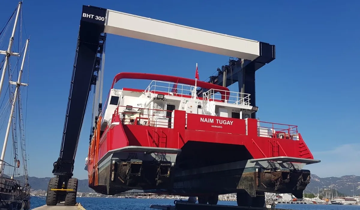 13,70 metre iç net genişliğe sahip olan tekne kaldırıcı, özellikle farklı tip ve boyutlardaki katamaran teknelerin güvenli şekilde taşınmasına olanak sağlıyor. Sistem, elektronik sürüş ve kontrol altyapısı, yüksek manevra kabiliyeti ve ağır hizmet koşullarına uygun yapısal tasarımıyla öne çıkıyor.