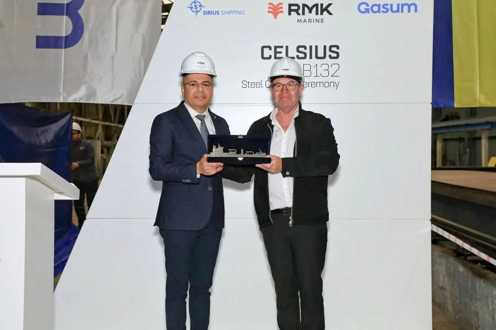 RMK Marine’in, İsveçli Sirius Shipping ve Finlandiyalı devlet enerji şirketi Gasum ortaklığı için inşa edeceği biyo-LNG bunker gemisi için çelik kesme töreni düzenlendi. Törende Gasum CEO’su Mika Wiljanen de hazır bulundu ve RMK Marine Genel Müdürü Utku Alanç ile beraber hatıra çelik plaketi imzaladı.