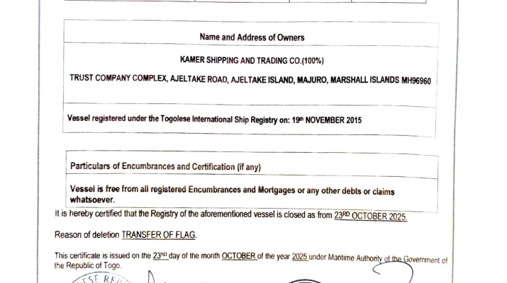 “Gemi, bayrak devletinin düzenlediği 23 Ekim 2025 tarihli Terkin Sertifikası ile şirketimizin kayıtlarından tam ve kesin olarak çıkmıştır. Gemi 27 Ekim 2025 tarihinde CAPO MARITIME CO. ya fiili olarak teslim edilmiştir ve o tarihten itibaren gemi üzerinde şirketimizin mülkiyet, yönetim, operasyonel veya ticari herhangi bir kontrolü bulunmamaktadır”