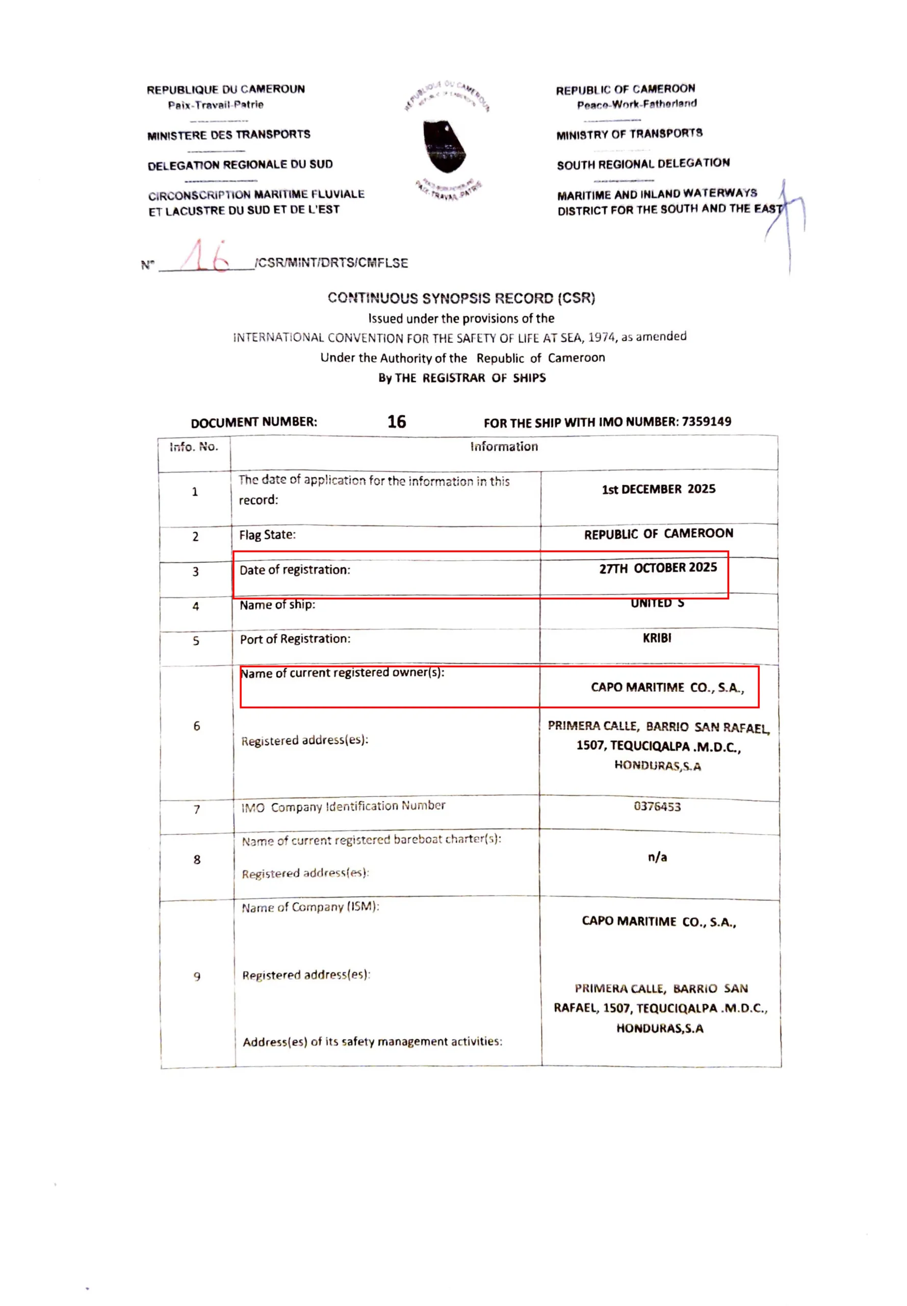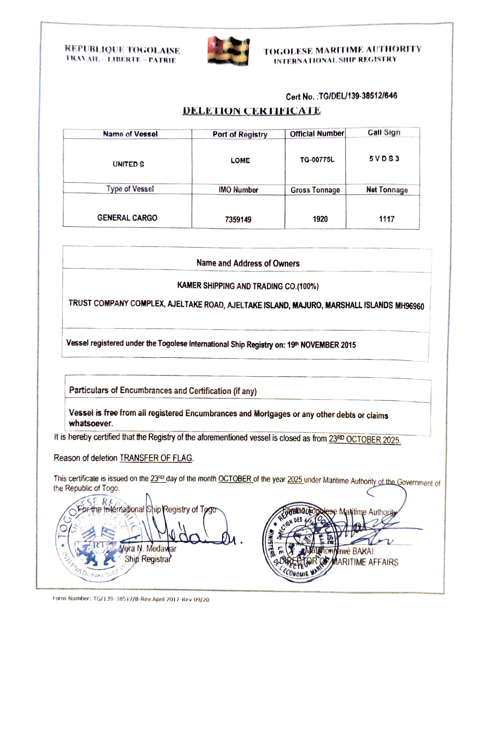 HaberDenizde.com’a bir açıklama gönderen, Kamer Shipping & Trading Co. Kurucu Ortağı Ahmed Almassri UNITED S isimli, 7359149 IMO numaralı geminin 9 Ekim 2025 tarihli sözleşme ile Honduras adresli CAPO MARITIME CO. ünvanlı şirkete satıldığını bildirdi.