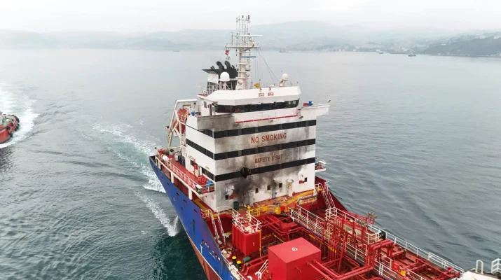 Ukrayna Odessa açıklarında limana girmek için beklerken bir dron tarafından vurulan Ata Voyager adlı tanker, İstanbul Boğazı’ndan geçerken görüntülendi.