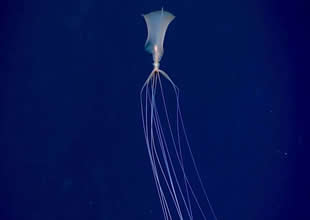 Okyanusun gizemli canlısı! Kolları gövdesinden 20 kat daha uzun Büyük Yüzgeçli Kalamar (Magnapinna), okyanusun karanlık dehlizlerinde görüntülendi. Güneş ışığının asla ulaşmadığı binlerce metre derinlikte yaşayan bu devasa kollu canlı, alışılagelmişin dışındaki anatomisiyle korku ve merak uyandırıyor. |