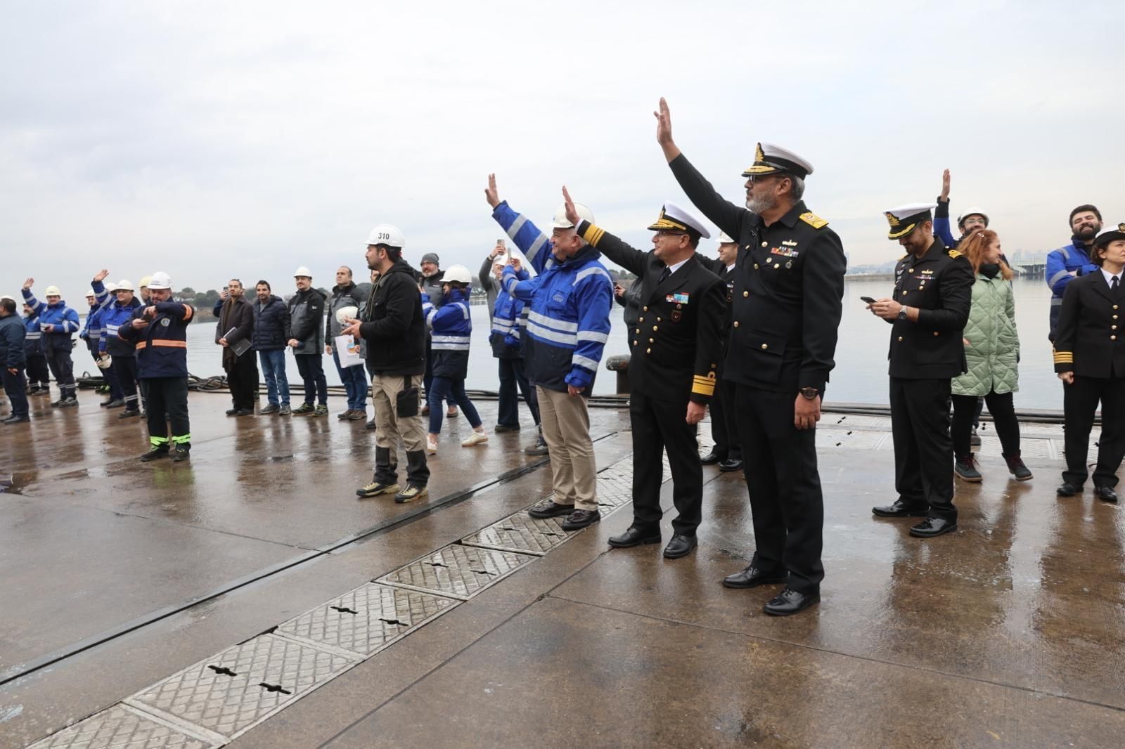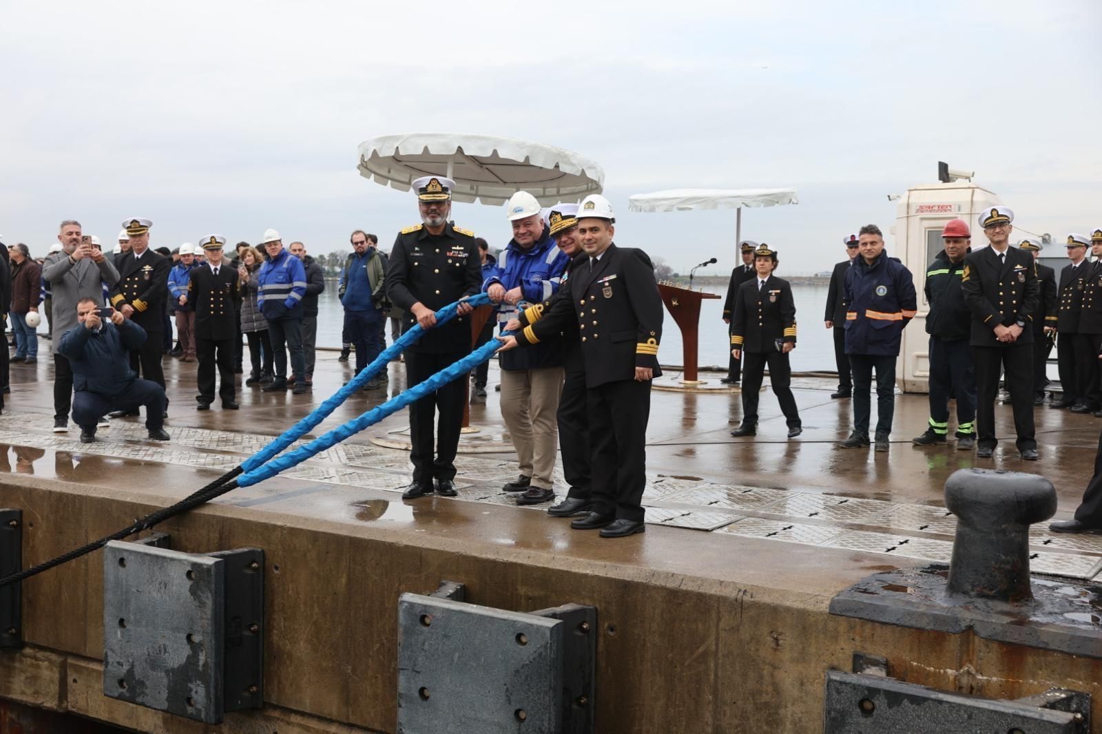 PNS KHAIBAR’ı uğurlama töreninde, İstanbul Tersanesi Komutanı Tümamiral Recep Erdinç Yetkin ile personel de hazır bulundu.