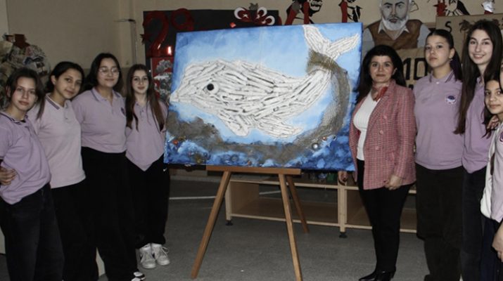 Daha sonra ailesinden balinanın hikayesini dinlediğini anlatan Yaş, “Sonra öğretmenimizin yardımıyla sahile giderek odun topladık. Topladığımız odunları önce birleştirdik, sonra boyadık. Bir ağ bağladık, ağa yakalanmış gibi bir görüntü vermek istedik” ifadelerini kullandı.