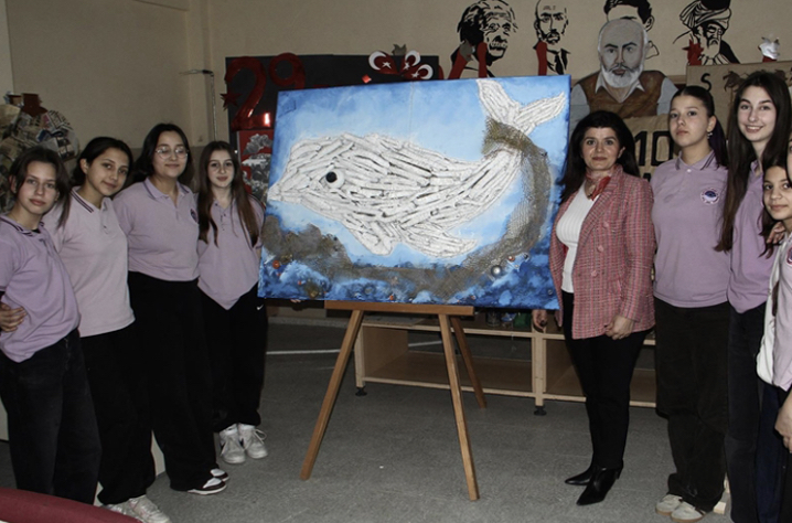 Proje kapsamında aileleriyle görüşerek “Balina Aydın”ın hikayesini dinleyen öğrenciler, hem geri dönüşümün önemine dikkat çekmek hem de yerel hafızayı günümüze taşımak hedefiyle atık malzemelerle “Balina Aydın” rölyefi yapmaya karar verdi.