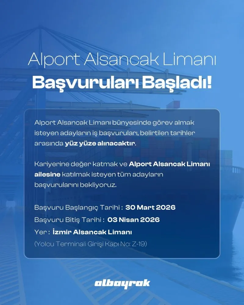 “Alport Alsancak Limanı Başvuruları Başladı” başlığı ve “Kariyer rotanı denize çevirmenin tam zamanı!” alt başlığı ile yayınlanan ilanda, “Alport Alsancak Limanı bünyesinde görev almak isteyen adaylar için başvurular başlıyor. Güçlü bir ekibin parçası olmak ve kariyerine yeni bir yön vermek için seni de aramızda görmek istiyoruz” denildi.