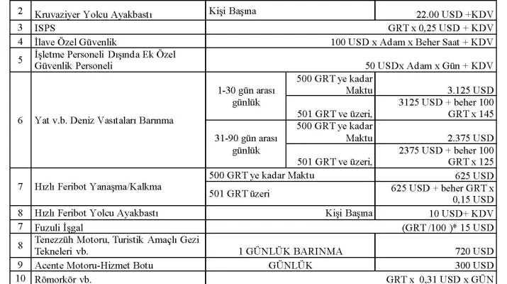 Türkiye Denizcilik İşletmeleri (TDİ), işletmesinde bulunan Sarayburnu Limanı, Kuruçeşme Limanı, Kabatepe ve Kuzu limanlarıyla Karaköy Rıhtım hizmetleri tarifelerini yeniledi. TDİ Limanlar Dairesi Başkanlığı tarafından