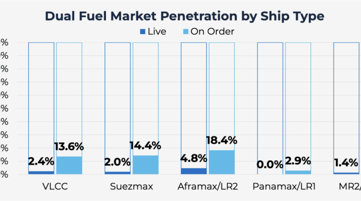 Tanker sektöründe, çift yakıt kullanımının yaygınlaşması henüz başlangıç aşamasında olmakla birlikte; aktif filo penetrasyonu Panamax/LR1 gemilerinde %0’dan Aframax/LR2 tonajında sadece %4,8’e kadar değişebiliyor. Bununla